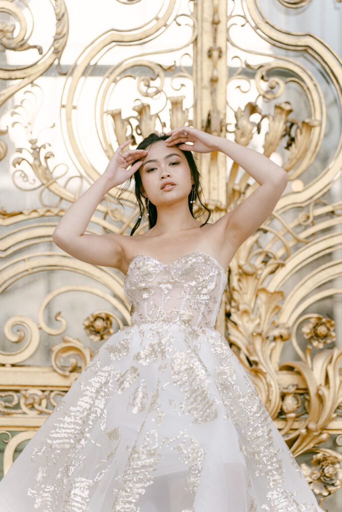 The bride wore a radiant gown by Nicole + Felicia Couture, embroidered with hundreds of golden sequins.